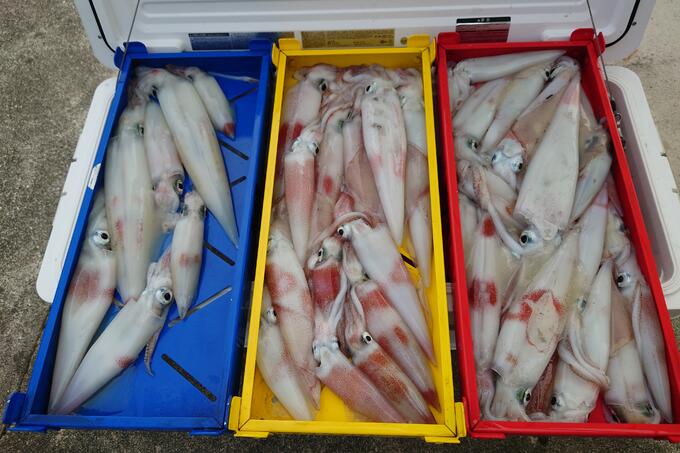ケンサキイカを釣りに行ってみました、前日は凄い雨の為、海に濁りが凄く厳しい釣りでした棚はボトムでロングステイ、オモリグ