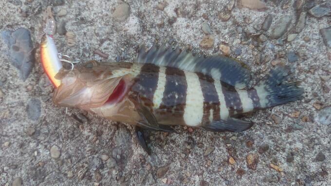 浅場のポイントに多いのが小型アオハタです。プラグへの反応も良く、LGヘビーミノー、LGバイブで遊べます。