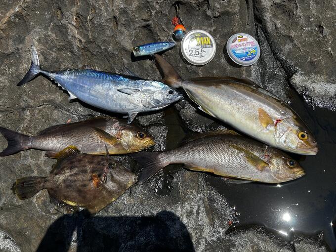 イサキ狙って中泊へ釣行しました。乗船して船長に近況を確認すると、イサキはポツポツで青物(カンパチとカツオ)が上がっているとのこと。(バイトはトップが多いとのこと)5:00出船→松島のヒロッパへ渡礁した。開始前に釣座の足元を確認すると、無数のキビナゴが…いつ青物が回遊しても対応できるようにルアータックルも準備しておく。まずはイサキを狙ってフカセ仕掛けで6:00実釣開始。1投目仕掛けを流していると磯際のキビナゴ群が逃げるように移動する。青物が回って来た。すぐにフカセ仕掛けを回収して準備しておいたLブルーバブルジェットをキャストすると1投目でフッキングに成功!上がって来たのは40センチ程度のカンパチだった。その後、バイト付近を丁寧に探るもバイトが無かったため、フカセに変更した1投目、道糸が弾き出るアタリ!竿を立てると横走りしたことから青物と確信。上がって来たのは丸々としたマルソウダだった!その後、キツ(イスズミ)の強烈なやり取りを楽しみ、本命のイサギも2尾追加してタイムアップ。満足な釣行となった。