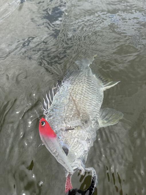 暑い夏は川へ入水して暑さを和らげながらチニング! クイックドッグペンシルで流心からヨレヲ丁寧に探っていくとバイトしました!