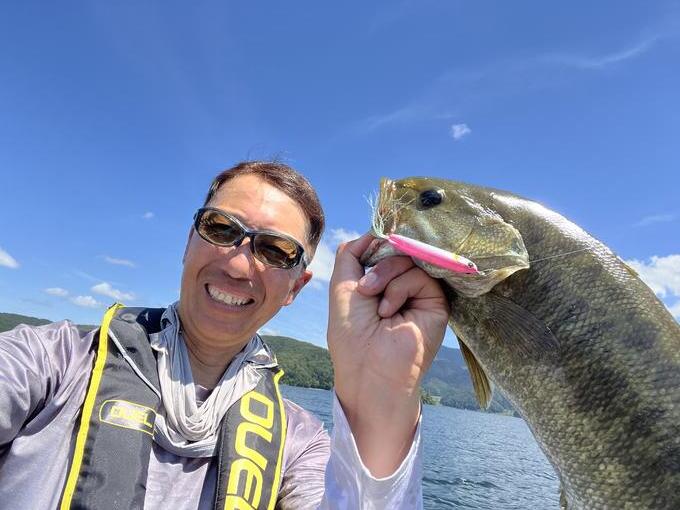 信州野尻湖。まだまだお天気は夏っぽいですが、水の中は秋っぽくなってきました。沖の表層にワカサギ群が集まりだしてきて、ボイルも多くみられます。ロングキャストが売りのラトゥールIGにてこの日は表層トゥイッチにて。マックス47センチ。小さいバスから大型まで沖の表層楽しめます。