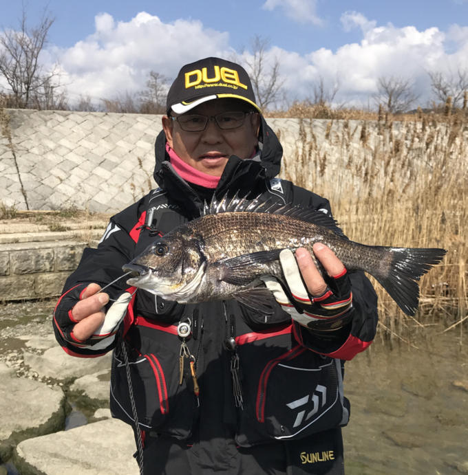 昨日に続き、早朝より紀ノ川に行ってきました。爆風の西風の為、右岸の六十谷船着きに釣り座を構えましたが、立っているのもつらいほどの風です。釣り始めて1時間くらいたった頃に風が少しましになり、それにつれて流れもいい感じに上流に流れ始め、これは、釣れるなと思った瞬間、絵に描いたようなウキ入れで40センチジャストの真っ黒のチヌをゲットできました。それからまた風が強くなり、流れも激流となり納竿としました。