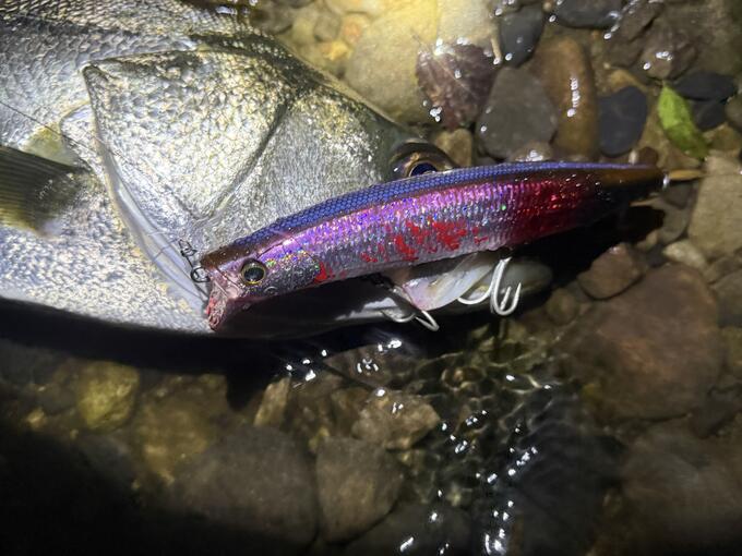 S Bウェイクを使って清流域のシーバスゲーム! 川の合流地点をゆっくり流しながら引いてくると、いいサイズがヒット!