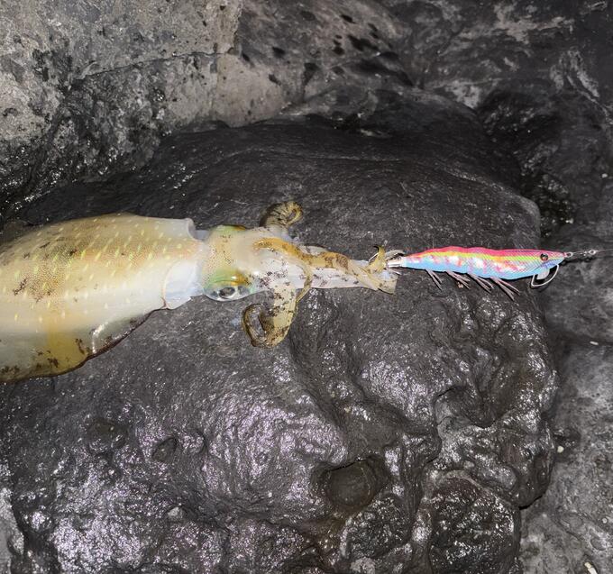 波が収まったタイミングでキャスト!中層で!ひったくる当たりが!水温も高いので元気な烏賊ちゃんでした!