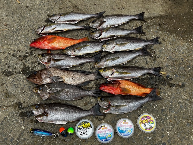 中泊(ツルクビ)での釣果です。グレを狙っての釣行でしたが目視では確認できず、潮の中を探ってもアタリが出ないため、竿一本半でイサギ狙いに変更。3人で20匹以上のイサギを釣り上げた。他の磯ではグレの数はまだ出てないがポツポツと上がっていました。尾長も50㎝overが数匹上がっていました。まだ磯ムラがあるようです。