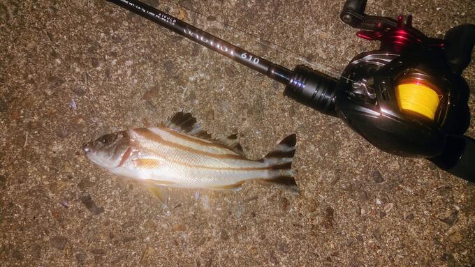 小型のシマイサキとよく間違われるのが、画像の魚、コトヒキです。ポッパーやミノー、スプーン、スピナーとルアーへの反応も上々でライトタックルで狙うと面白い魚です。今回は地元アジング中のワームにヒットしました。