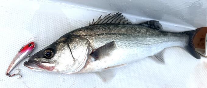 この日は急激に気温が下がった翌日、ベイトについたシーバスのレンジもごろごろ変わります。 そんな時は躊躇なくヘビーなバイブレーションをぶん投げる。でボトムまで一気に沈め、ボトムトレースでゴリゴリ巻いてやる。カラーは元気ないかもしれないボトムべったりのランカーなので、レッドヘッドでアピールしちゃうんですよ!! で、結果…大成功!!