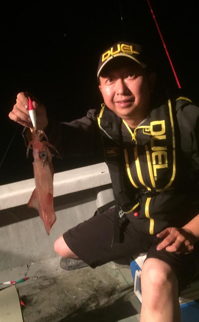 今シーズン2回目となる夜炊きのヤリイカ狙いで釣行。今回も門司さんにお願いして私の同級生杉原さんや会社の上長高木さんも誘っての釣行となった。日中は西風が吹いており、多少ウネリが残る海へと午後6時半出船。前回と同様のポイントに着き、アンカーを降ろして早速釣り開始。開始直後からポツリポツリとヒットしてくるが、イカの活性が本格化したのは2時間ほどたった頃。タナも10m付近まで浅くなり、手返し良く釣り上げて行く。潮まわりが小さいせいか前回よりもダブル、トリプルは少ないがそれでも満足いく釣果を得る事が出来た。