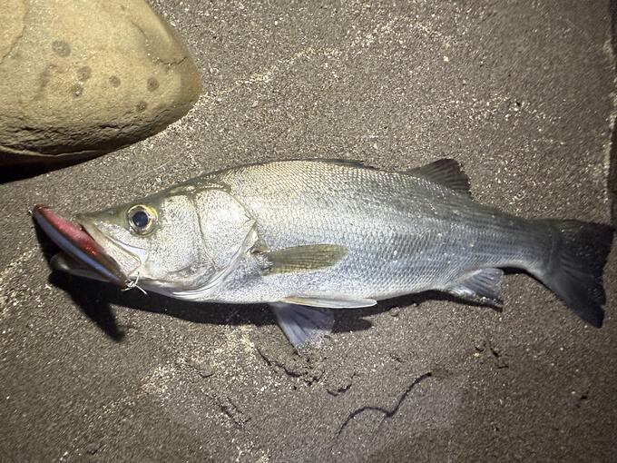 来年春発売予定のSBウェイクを流れの払い出しに乗せて、ヨレの部分でゆっくり巻いていたらヒット!いいサイズのヒラスズキでした!