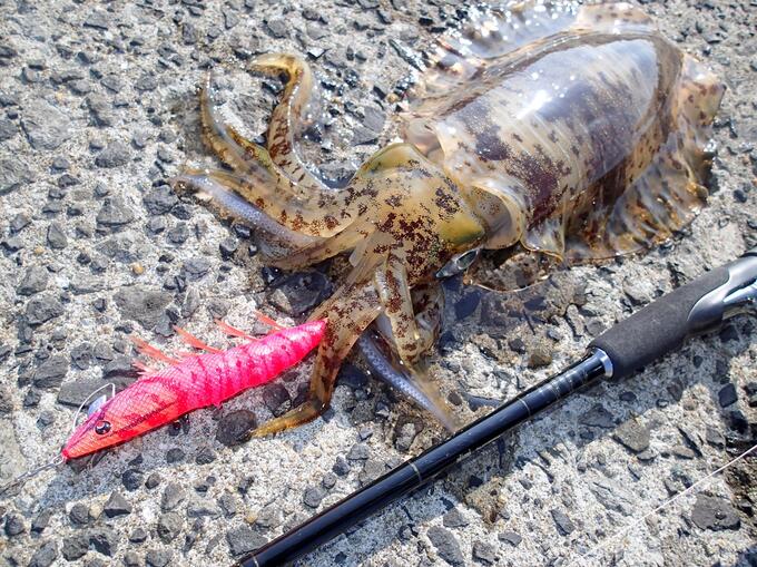 早朝より快調にヒットしていた快晴日和のデイエギング。さすがに真昼間には、アタリが遠い。そこで、紫外線発光しつつシルエットがハッキリ出るネオンフラッシュ®レッドボディ採用の‘どんよりレッド’でハイアピールに攻めると、遠投のボトムでズドンとヒットしてきました。
