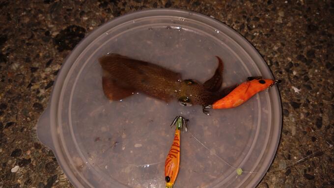 常夜灯下の明暗境くらいから表層〜宙層を引いてくると2〜3匹のヒイカが足元まで追尾♪ なかなかヤル気があるヒイカが居て期待大
