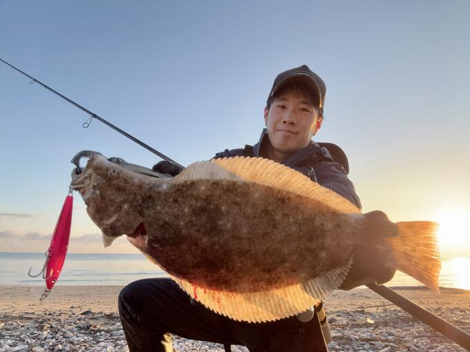 新年初釣行、初フィッシュはヒラメ!SBショットで手前のブレイクラインをより長く引いてこれるように斜めに投げてスローに巻いてくるとヒットでした!!