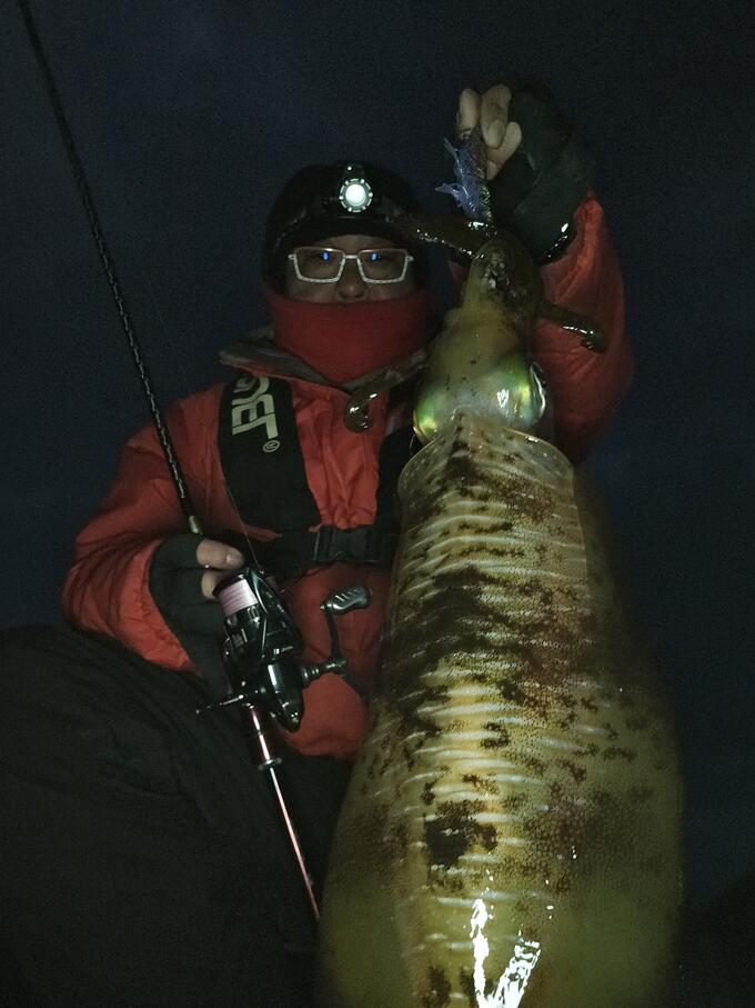 時折雪が降る風の強い寒い日でしたがやっぱり投げに行ってしまいました(笑) 海水温はまだ17度ほどあり例年よりはまだ高いみたいです キャストしてすぐコツっと手元にあたり⁉️ あわせるも何もなく潮かな?と思っていたらもう一度同じあたり しっかりイカでした✌️