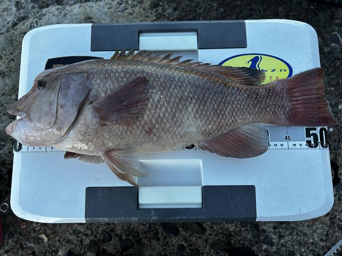 マダイのアタリが途絶えたため、磯際で大物のバラシがあったポイントを再度攻めてみた。竿一本半の棚でウキはポートマスター1.5号、シンカー1号でダイレクトに仕掛けを入れると気持ちよくポートマスターが反応する。ドッシリとした重量感!約3分の格闘を経て上がってきたのは55㎝のコブダイ!ハリスはピンクフロロ1.75号で磯に擦れザラザラだったがよく耐えてくれた!