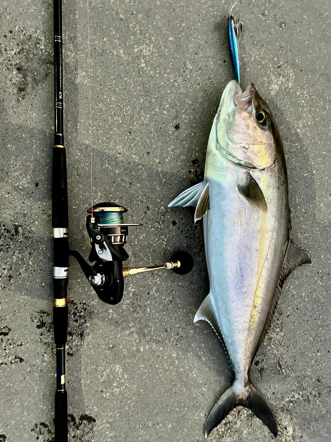 中層から表層のワンピッチジャークにて78センチのカンパチキャッチ