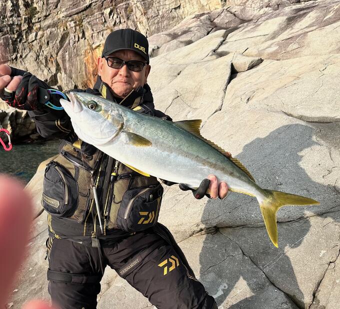 上甑島 2日目。本日も風のため 港近くの 学校瀬 という磯に上がりましたが 水温が高く エサ取りの イズスミに翻弄されましたが ヒラマサの76センチが 最後に来てくれました。流石 甑島。