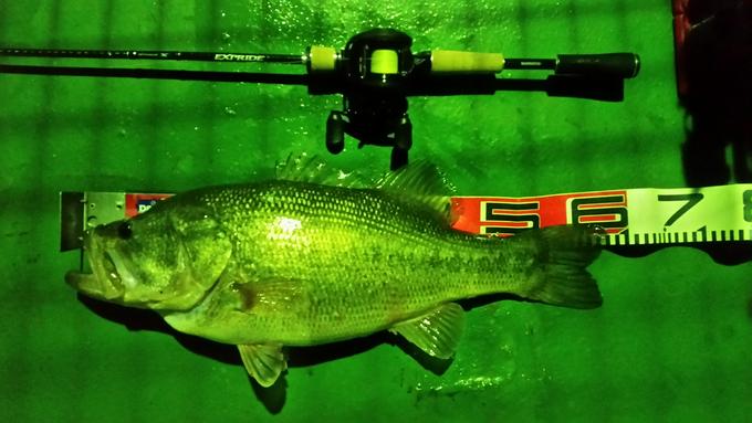 仕事帰りにバスフィッシングしてきました。先日購入した、ベイトフィネスタックルにアーマードラインを巻いての初釣行。実績の橋脚まわりを探っていると、足元でコン!とアタリ!?しっかりと体重を乗せた合わせでHIT!合わせた瞬間の重量感から、コイか?と思った瞬間にエラ洗いで自己新確定のバス!!ドラグを出して桟橋の奥に逃げ込もうとするのを無理やり止めて、引きずり出した1匹は余裕の自己新記録の58㎝。細くても強く、水に沈み高感度のアーマードラインはフィネスのラインとして心強いです。