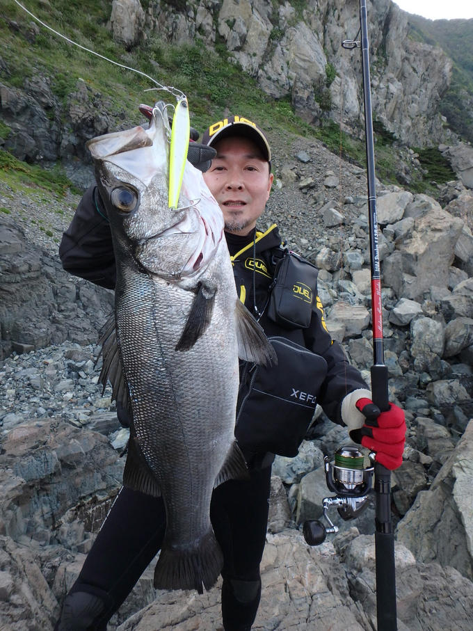下関沖の蓋井島(ふたおいじま)へヒラスズキ狙いに行って来ました。当地のヒラスズキポイントは、ガレ場や大岩の険しい地形が続きます。この為、ポジショニングに際しては足場が高い場面が多くありますが、磯際に点在する根回りや、足下から払出すサラシで、確りルアーをアピールさせることが大切です。この日はニューモデルのハードコア「ヘビーショット105」が大活躍!このリップ付きのヘビーウエイトシンキングペンシルは、アダージョヘビー譲りの遠投性能にプラスして、今までこの種のルアーが苦手としていた高足場からの接近戦を可能にしました。