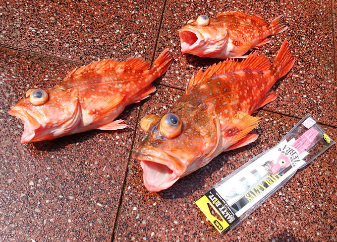 京都府舞鶴沖に出撃。潮止まりで昼食休憩。その間に美味しいお土産を獲ろうと、ソルティー・ベイト™100gを水深100mボトムに投入。ボトム着底から数mをシャクリ上げ、アタリがなければ再度ボトムへ・・・。これを繰り返すとすぐさま100mボトムから小気味よい魚信が・・・。数投で美味しそうなガシラ3尾ゲット!ソルティー・ベイトの活躍に大感謝でした。