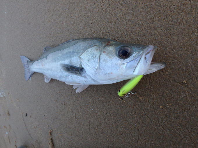 博多湾のサーフへトップゲームに行って来ました。この季節、サーフではシーバスやチヌ(クロダイ)等が狙えます。この日は向い風が強く海面が波立つ程で、ルアーアクションが思うように決まりません。そんな状況でしたが、波打ち際から10m弱のラインからシーバスがヒット!ヒットルアーは、ヨーヅリの3Dインショア ポッパーです。少し大きめのカップからは、ポップ音とスプラッシュで確りアピールしてくれました。シャローには沢山のベイトを確認出来たので期待大です。