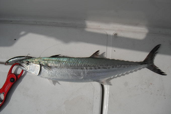 ボートエギングの合間にサゴシを釣りました。サゴシが跳ねている付近に停船し、ミノーを遠投、早めのリトリーブで50㎝前後ののサゴシが入れ食いに♪クーラーをサゴシでいっぱいにして、エギングを再開した。