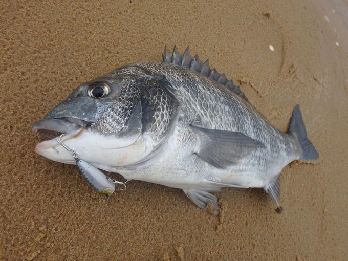 前日に続き博多湾サーフのトップゲームへ!この日は風も無く凪です。スローに少し大人し目のポップ音でチヌを誘います。ランガン1時間、3Dインショア ポッパーの背後に「もぁ~」っとチヌの気配です。やっぱり居ました!そしてその数投目、「ガポッ!」とバイト!しかし、ちょっと合わせが早かった感じでフッキング出来ず。その後、エリアを戻りながらチェックするも暫く反応ナシ。ルアーをヨーヅリのエバポッパーへチェンジし、朝一は干上がっていた所に満ち込んだシャローをチェック。すると、ここで出ました!水深50cmからヒットです。キビレの割合が高い当地では珍しい本チヌ(クロダイ)です。博多湾のサーフ!楽しみな季節になりました。