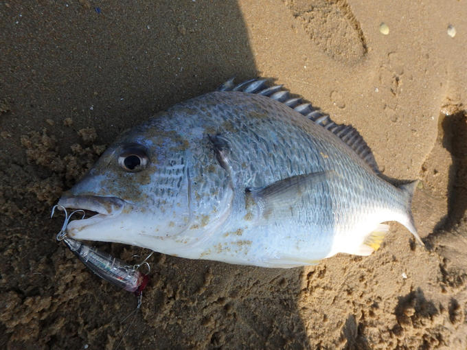 ハイシーズンに突入した博多湾サーフのトップゲームへまた行って来ました。ベイトの密度はさらに濃くなっており、メンバーのキビレのヒットを皮切りに、2人で5~6バイトを得ました。しかしキャッチ出来たのはその半分程。着水直後のポッパーに「ガポッ!」とバイトする高活性な一面も見られましたが、硬く密な歯を持つ口内へのフッキングが甘く、足下で「ポロリ」してしまう場面も、、、。フックサイズのアレンジや、喰わせ方、アワセ方等、課題が残る展開は次回の対策へ繋げたいと思います。