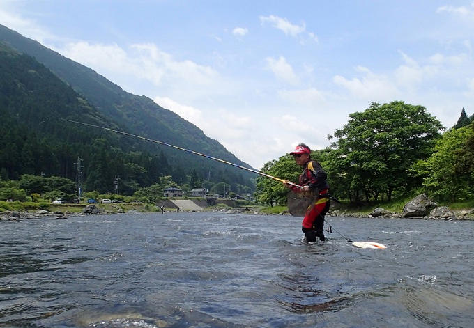 昨日の解禁で一番アユが釣り上げられた2日目、続く2番アユがどれほどの釣れっぷりなのかを見ると、その河川の今シーズンの実力が分かる。昨日快釣していたザラ瀬のポイントを攻めると、やはり即ヒットはない。それでも狭いピンスポットで連発があり、朝2時間で12尾。それなら、緩い流れで泳がせれば・・・とポイント移動。これが正解。3時過ぎの雷雨で強制終了させられるまでの4時間、破竹の入れ掛かりで40尾。今日もまたまた、Armored® FH 鮎-0.06号が良い仕事をしてくれました。