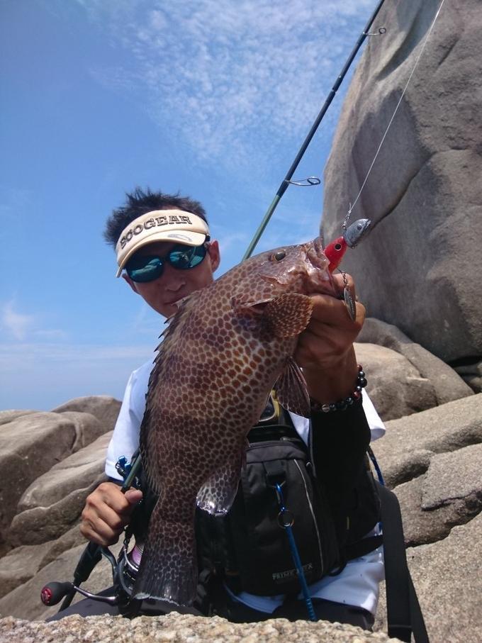 渡船を利用して冲磯へハタゲームに行って来ました。朝マズメは潮の流れが弱く、魚の活性も低く、ベイトフィッシュも見えない状況だったため、ボトムを中心にジグヘッドのスイミングでオオモンハタを狙ってみます。なかなかアタリが無いなか、潮が効き始めたタイミングでボトムからの高速スイミングでバイト。手前の根に何度か入られましたが無事ランディング。その後、アカハタ狙いにシフトしてテキサスリグでボトムをネチネチ攻めると磯際のブレイクで良型のアカハタをキャッチすることが出来ました。