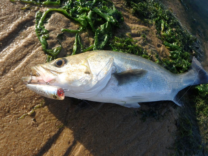 博多湾サーフへトップゲームに行って来ました。約一月ぶりにサーフに行ってみると、一帯は海藻密集地帯に様変わりしていました。少しずつ秋に近ずいていることを実感。この海藻帯は、キビレやチヌが付く好条件の一つで、ハイシーズン突入のシグナルです。そしてこの日は、開始早々に「3Dインショアポッパー」にキビレがヒット!その後、上げ潮に変わったタイミングでシーバスの回遊があり、3バイト中、2尾をキャッチ!ヒットルアーは「シルバーポップ60」。ベイトは一時期より多くはありませんが、まずまずの濃さを継続中で、期待大です!