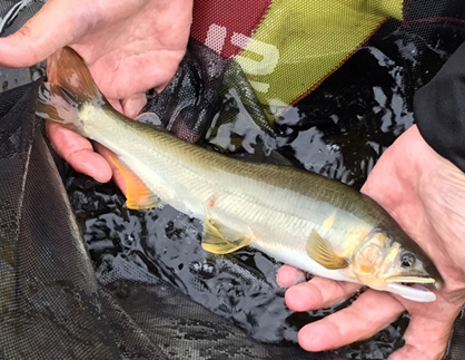 昨日に続く2日目の釣行は、昨日以上の大アユに狙いを絞り、仲間たちと激流をアタックした。全員26~27㎝の大アユを仕留めた夕刻、荒瀬の前に全員集合した。その前でロッドを握る私もそろそろ納竿かなと思った瞬間、竿先が荒瀬に吸い込まれ、ロッドは満月に絞り込まれた。皆の声援を受けて荒瀬を駆け下り、仕留めた大アユは28.5㎝!今回の最大サイズで締めくくった楽しい今回の遠征釣行でも、Armored® FH 鮎-水中糸- 24M 0.20号は大活躍でした!