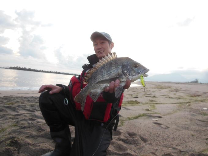 久々にまとまった雨が降ったので夜勤明けの朝マズメのサーフのシーバスゲームに行ってきました。しかし降りすぎたせいか泥濁りの真っ茶色・・・とりあえず様子見で125mmのフローティングミノーで2投目でドン!!あっさりと60クラスをキャッチ!!続いて10分後、再び60クラスを追加。うっすら明るくなってきたので表層系の出番と言う事で新発売のYO-ZURI 3D INSHOREサーフェスミノーで水面をモコモコするとドン!!更に60クラスのシーバスを追加!!そして夜が明け、太陽が出るとシルバードッグにチェイス&バイト・・・でも乗らず・・・そこでもう一回、3D INSHOREサーフェスミノーで、水面モコモコ系で波打ち際をゆっくり攻めるとドン!!シルバードッグのバイトで何となくわかってたのですが予想通りのチヌ!!その後はデイゲーム定番のハードコアスピンで・・・カンパチとブリ!!お子様ですけどね(笑)DUEL&YO-ZURIルアーでシーバス、チヌ、カンパチ、ブリの4種をゲット!!DUEL&YO-ZURIルアーはワールドワイドなルアーラインナップだけに使い方次第で色々な魚を連れて来てくれます♪