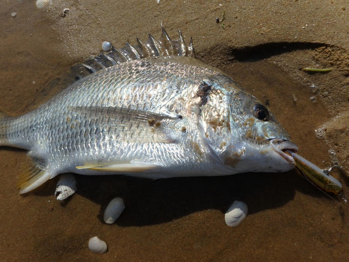 博多湾サーフのトップゲームに行って来ました。この日は早朝が干潮だったので、朝一は気になっているエリアの地形チェックに走り、当地に入ったのは9時頃のこと。完全に陽が高くなってからの実釣開始です。現地では上げ潮が活発なタイミングで、潮位は1m内のトップに出やすいシャローが広がります。そして直ぐに反応がありました!ファーストヒットはバラシてしまいましたが、さらに数投目にこのキビレがヒット!ヒットルアーは「シルバーポップ75(ホロアカキン)」です。その後、当地では度々あるキビレの密な回遊に当たり、1時間程で6バイトを得ることが出来ました。