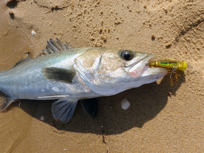 早朝の今津湾を終え、都市高で西から東へ移動。 博多湾のサーフで2ラウンド目スタートです。 実釣開始は9時頃、潮はかなり上がっており、第1ブレイク付近は1m程の水深です。 ベイトは相変わらず多く、ブレイクより数m上のシャローに群れています。 周辺を小刻みにランガンすること30分、風でさざ波立つ水面を割って写真のシーバスがヒット! ヒットルアーはYO-ZURI 「3Dインショアポッパー」です。 その後、同サイズを1尾追加。 当地では、キビレよりシーバスのバイト数が上回って来ました。